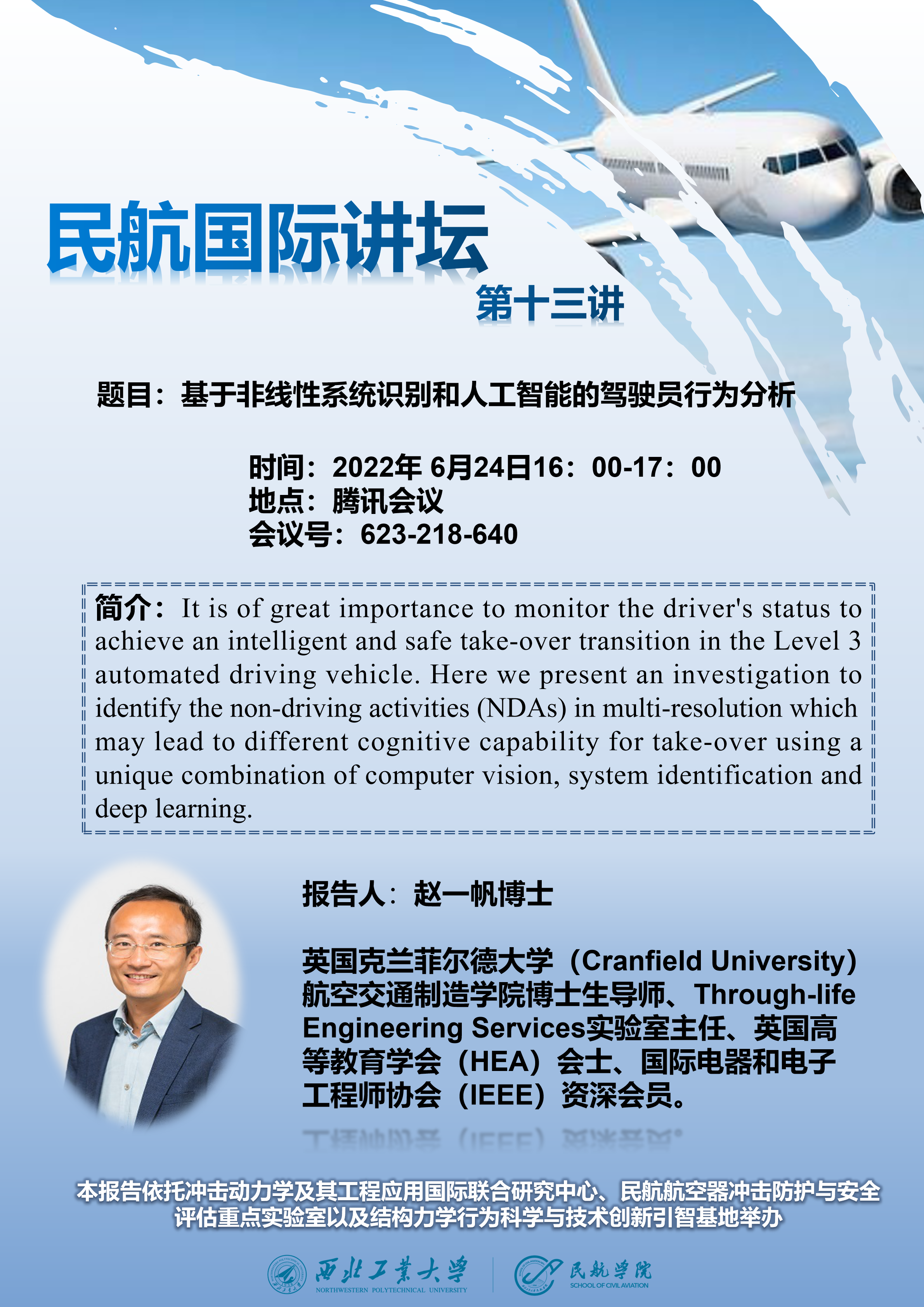 6月24日下午四点,美女视频 拟线上举办“基于非线性系统识别和人工智能的驾驶员行为分析”专题讲座,届时欢迎各位老师同学参会交流。报告信息如下: