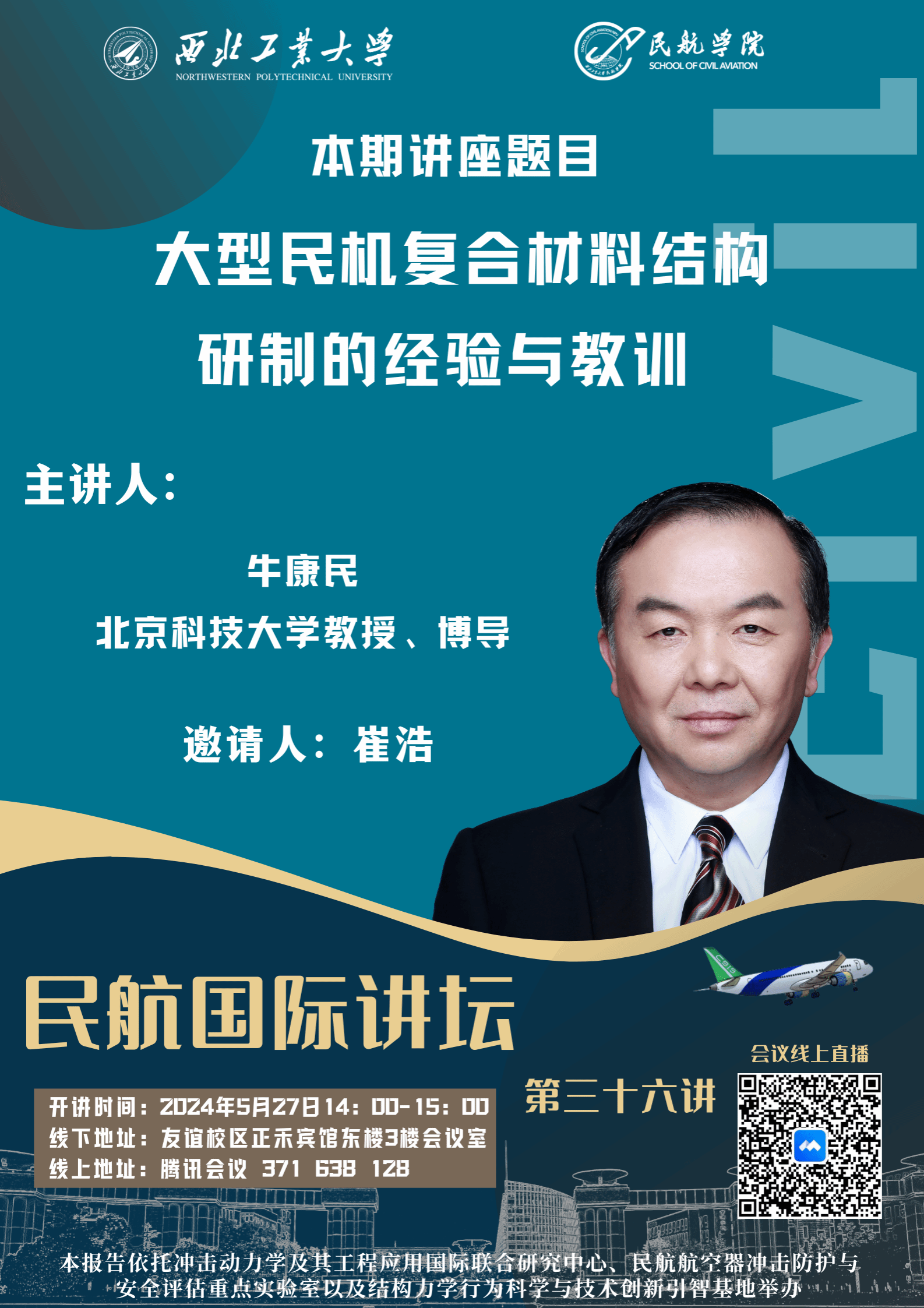 牛康民:北京科技大学教授、博导、北科杰出学者、国家特聘专家;现任北科大复合材料结构工程中心主任;此前任西门子公司院士工程师,负责新一代大型燃气轮机叶片完整性和寿命方法包括高性能碳纤维树脂基复合材料和陶瓷基复合材料结构。曾任美国波音公司机体结构实验室结构技术负责人,做为波音民用飞机集团复合材料结构资深专家参与了最新型777X、787梦想飞机机翼和机身结构的设计、分析与试验。主导确立公司非线性有限元模型分析方法。