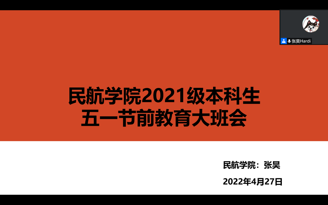 通过线上会议召开2021级本科生五一假期安全教育暨学风建设大班会,学院21级本科生辅导员张昊及全体2021级本科生参会。